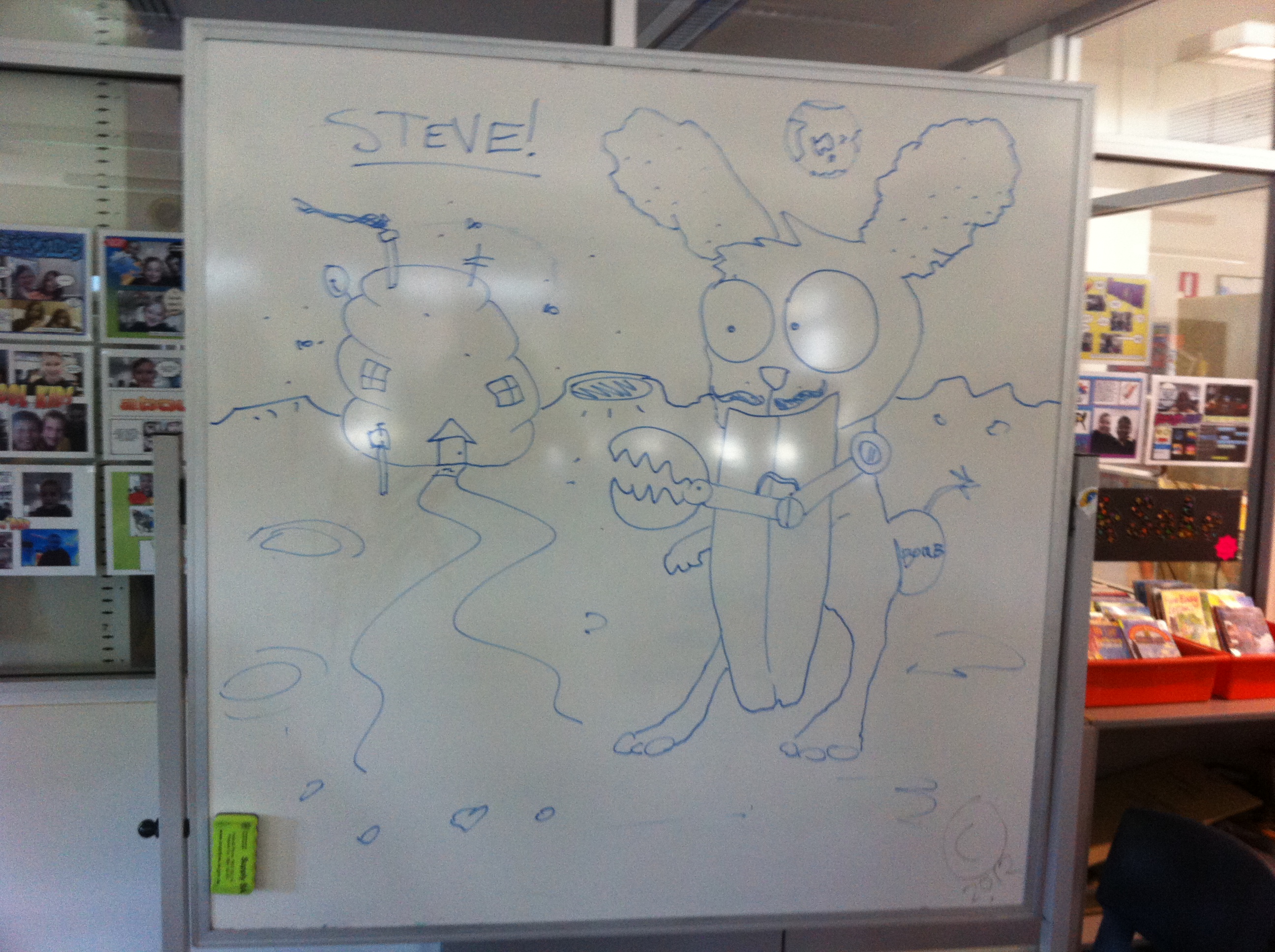 First up we have Steve the rabbit. He has a giant set of front teeth, a robot arm, fairy floss for ears and a bomb for a tale. Steve lives in a giant beer hive on the moon.