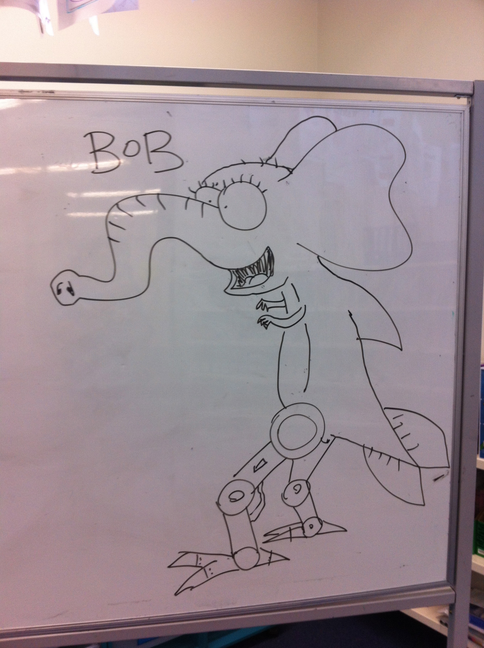Here www have Robert the elephant. He has a computer for a body, giant fingers for legs and carrots with mouths at the end of them for arms. He lives in house made out of cheese at the bottom of the ocean.