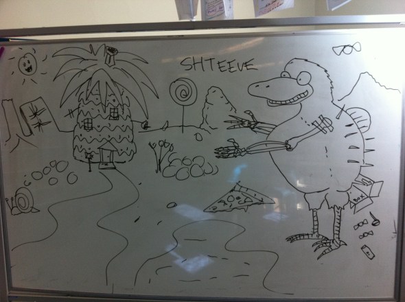 Last but not least we have Shteeve. He is a platypus with chicken legs, skeleton arms, a puffer fish’s body and a cardboard box for a tail. He live in a pineapple in Lolly Land.