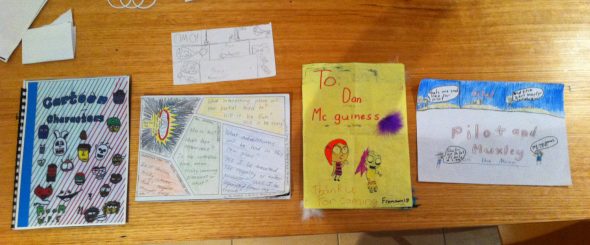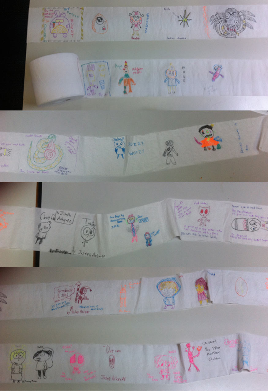 One of the classes remembered that in one of my books I wrote that I scribble comics into anything, even lolly wrappers. So they drew a whole bunch of characters on a toilet paper roll for me.