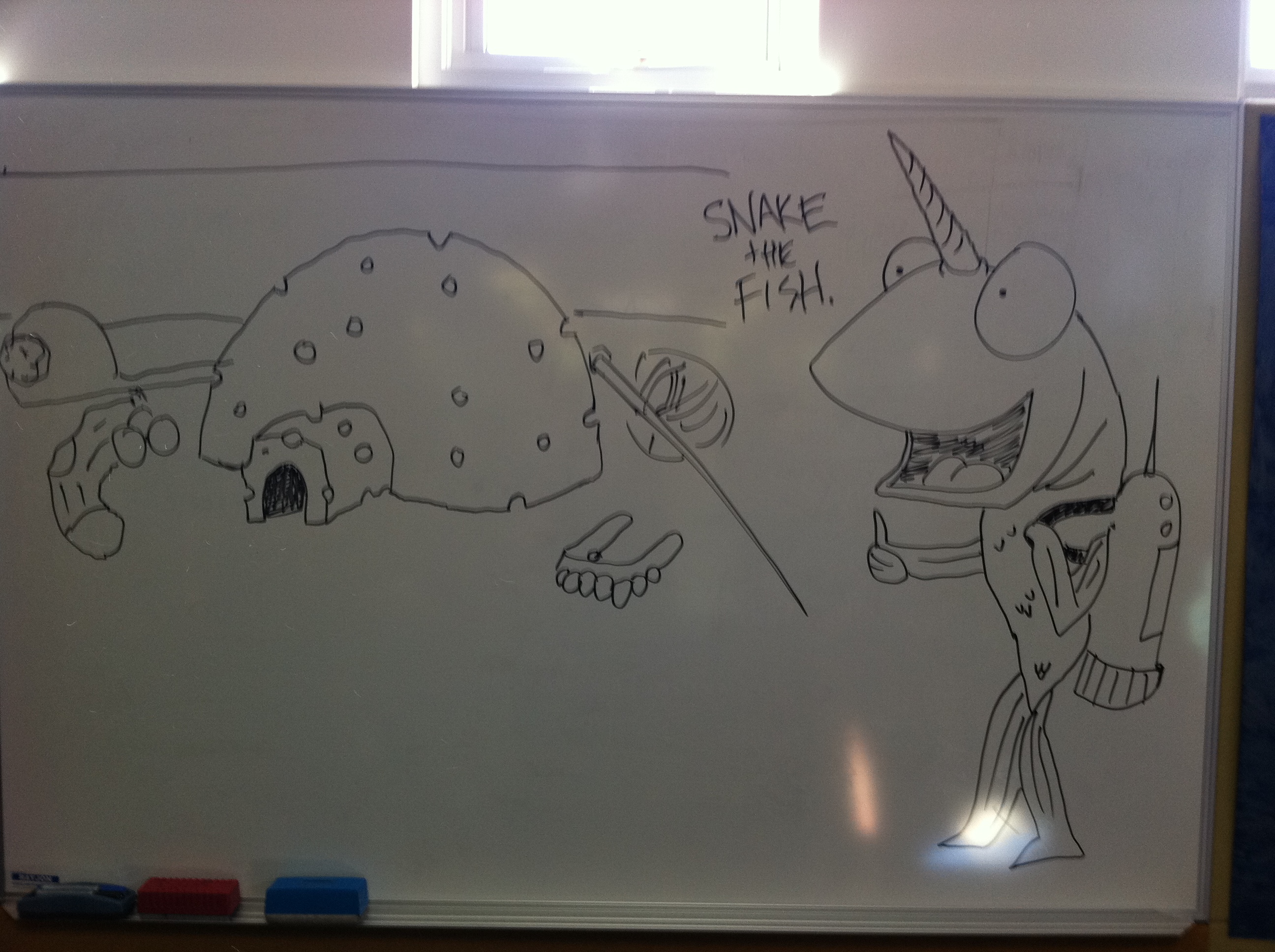 Here we have Snake the unicorn fish that wears a jetpack. He lives in an igloo made of cheese in an old ladies suitcase.