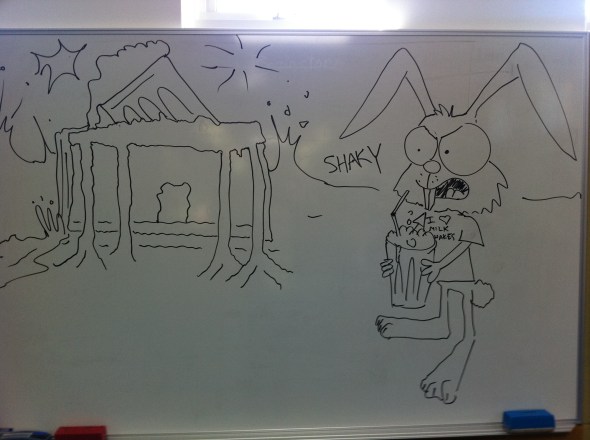 Next we have Shaky the rabbit that loves milkshakes. He lives in a milkshake marshmallow mason hotel that resides in the world of Boom.