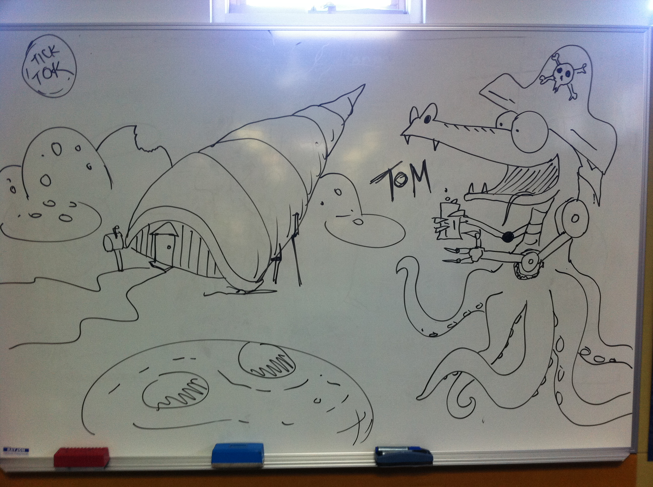 And last we have Tom the pirate dragon that has octopus legs and robot arms. He lives in an old hermit crab shell in the land of cookies.